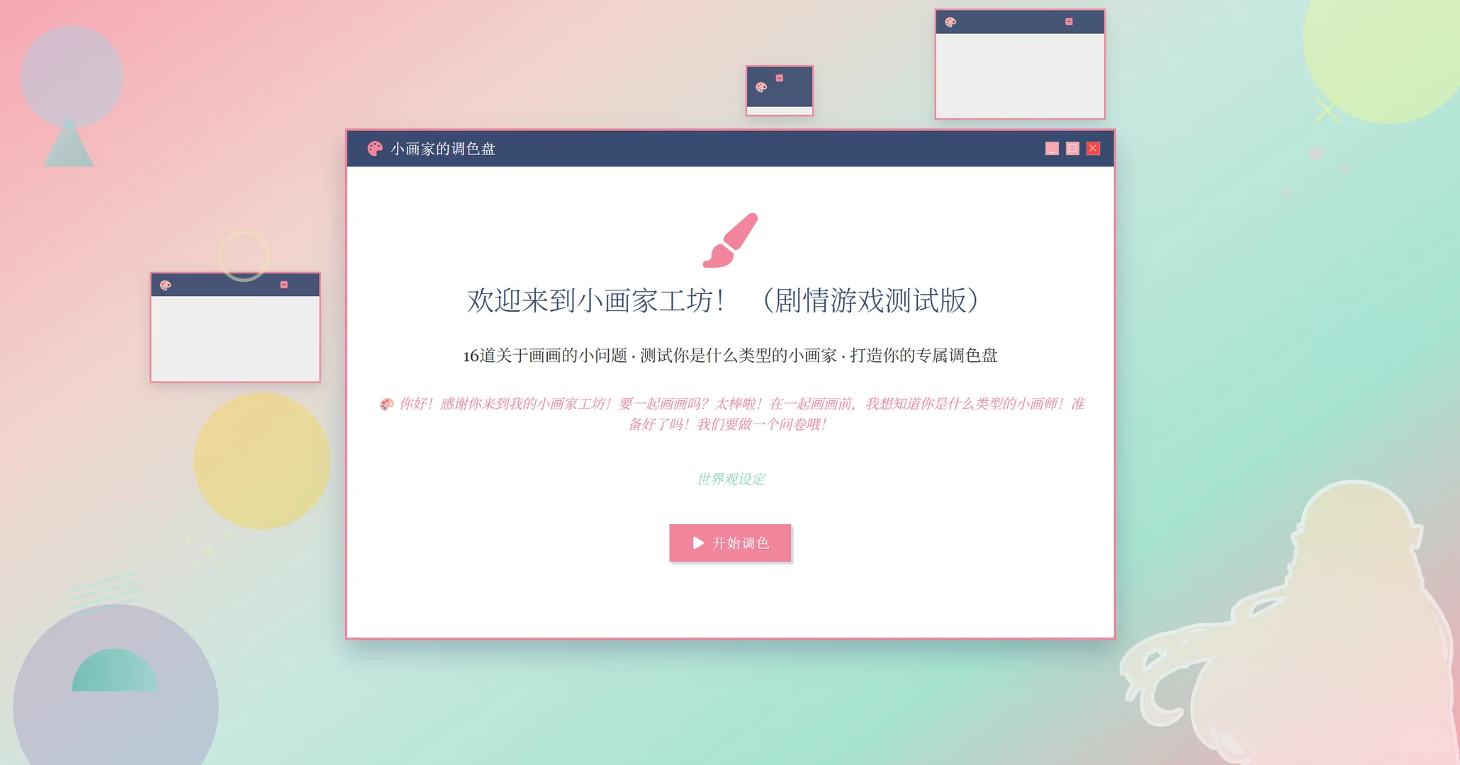 为了让它更接地气一点,更接近年轻人的喜好,我又融入了二次元的原创角色和互联网的小画家和galgame游戏内容,把【认识自己是什么样的人】变成了【你是什么样的小画家】。(当然还有一个原因是因为我完全是心理学的门外汉,以防会被评价为不懂装懂和不懂乱写和误人子弟,我倾向于把他解释成这是我的OC世界观设计仅供娱乐请勿过分解读。)
